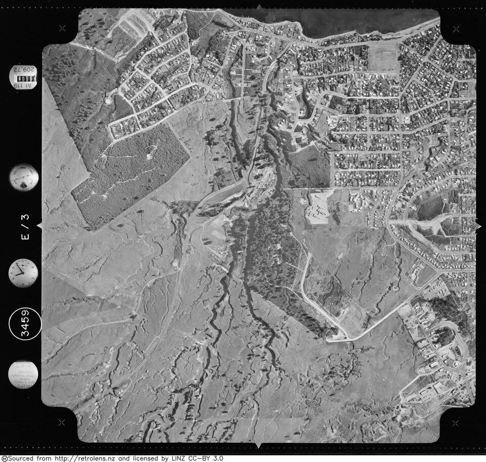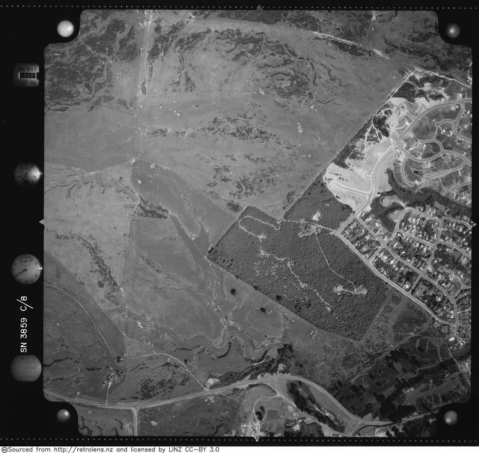 Only four years have passed, but inside the Reserve, the beginnings of the Camellia and Rhododendron Walks are evident, Lance's Area is also prominent, and a utility shed has been built opposite the first carpark. To the North, a new subdivision is being built - this is Richmond Heights.