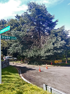 In October 2022 a part of the Cedrus atlantica glauca (blue cedar) at the gate of the Gardens collapsed. The arborist's advice was to fell the whole tree for safety's sake. It was a beautiful tree and it was sad to see it go.